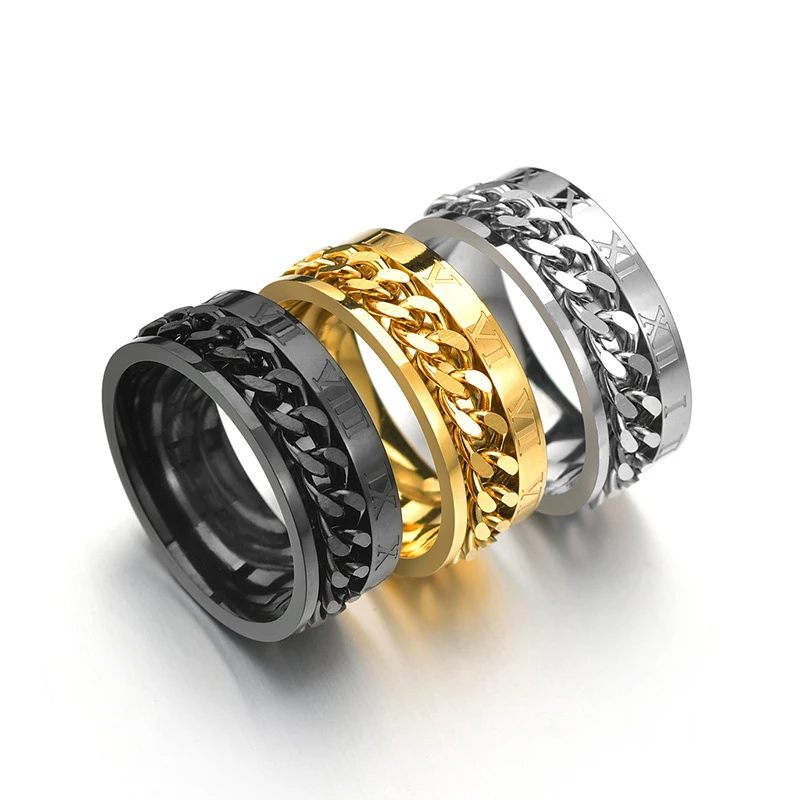 Name: Anillo de acero inoxidable con cadena giratoria para hombre, hilandero de oro de 8MM, banda Digital romana, Color plata, dorado y negro, joyería para hombre